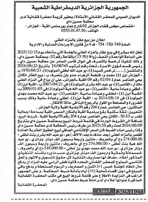 Il sera procédé à la vente au plus offrant et dernier enchérisseur le :