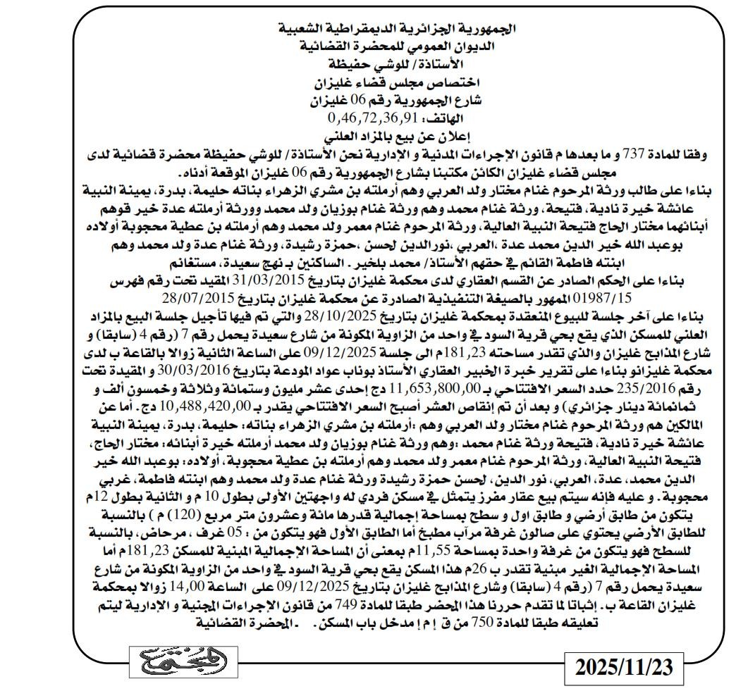Il sera procédé à la vente au plus offrant et dernier enchérisseur le :