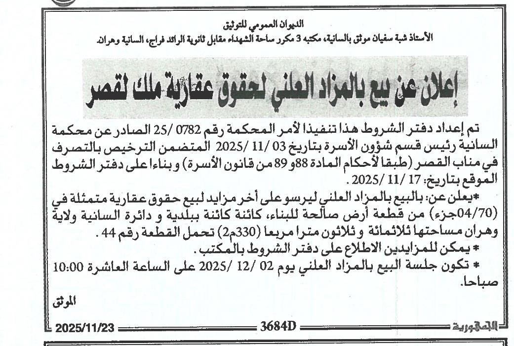 Il sera procédé à la vente au plus offrant et dernier enchérisseur le :