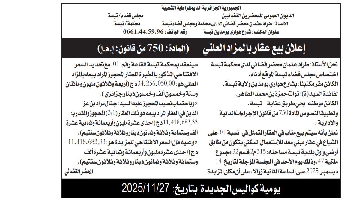 Il sera procédé à la vente au plus offrant et dernier enchérisseur le :