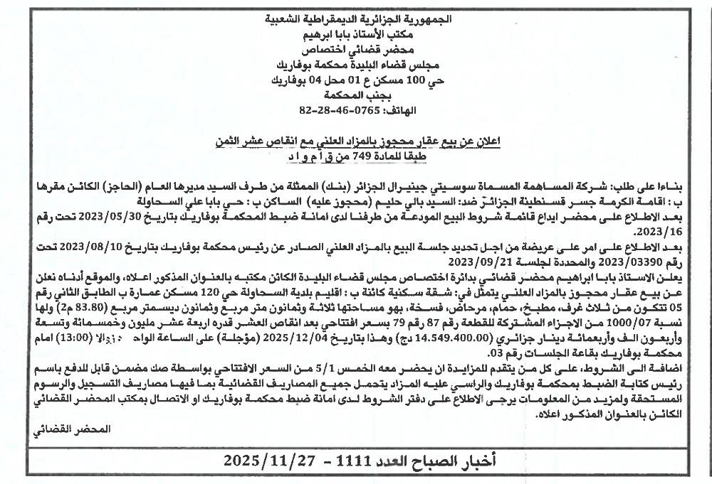 Il sera procédé à la vente au plus offrant et dernier enchérisseur le :