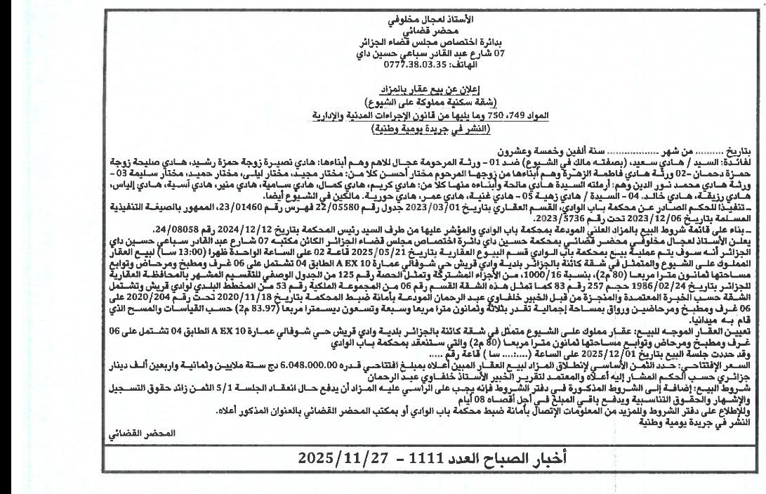Il sera procédé à la vente au plus offrant et dernier enchérisseur le :