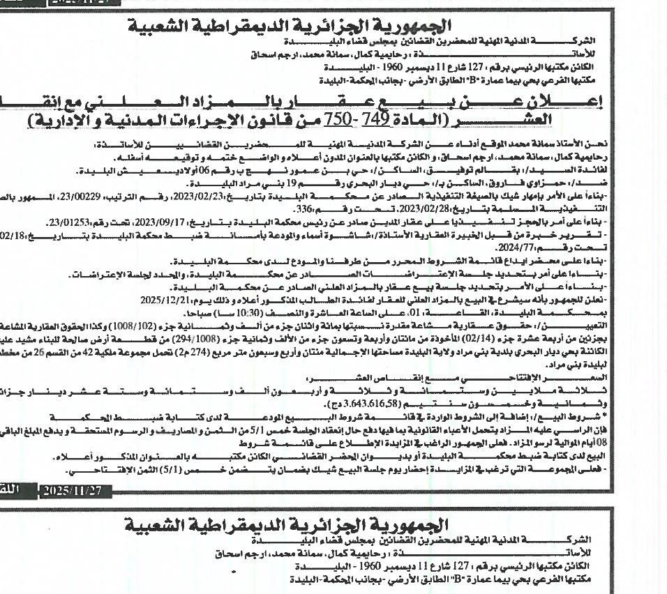 Il sera procédé à la vente au plus offrant et dernier enchérisseur le : 06/12/2025';
