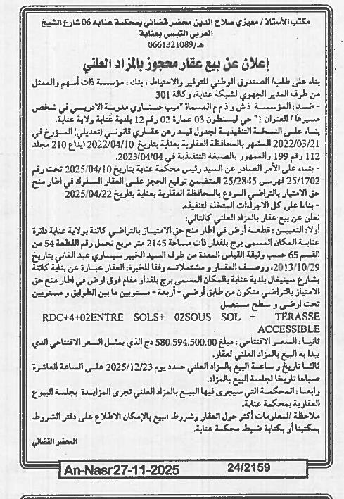 Il sera procédé à la vente au plus offrant et dernier enchérisseur le :