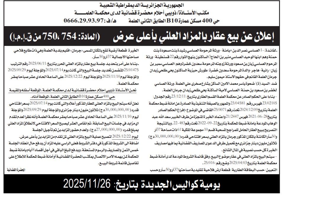 Il sera procédé à la vente au plus offrant et dernier enchérisseur le :