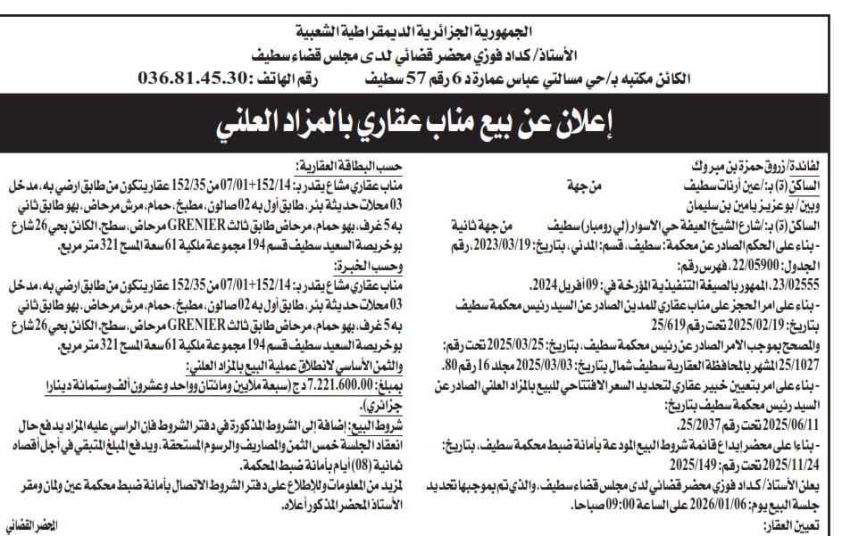Il sera procédé à la vente au plus offrant et dernier enchérisseur le : 06/01/2026';