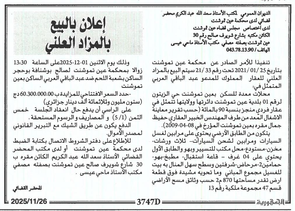 Il sera procédé à la vente au plus offrant et dernier enchérisseur le : 01/12/2025