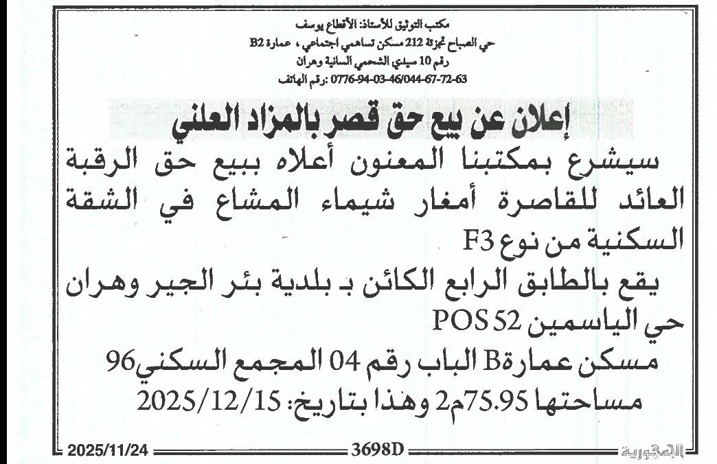 Il sera procédé à la vente au plus offrant et dernier enchérisseur le :