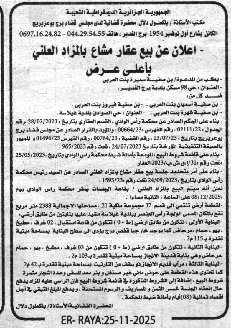 Il sera procédé à la vente au plus offrant et dernier enchérisseur le : 02/12/2025';