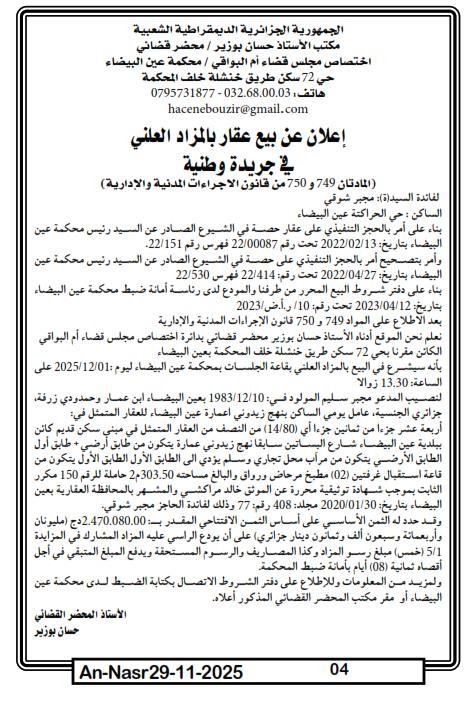 Il sera procédé à la vente au plus offrant et dernier enchérisseur le :