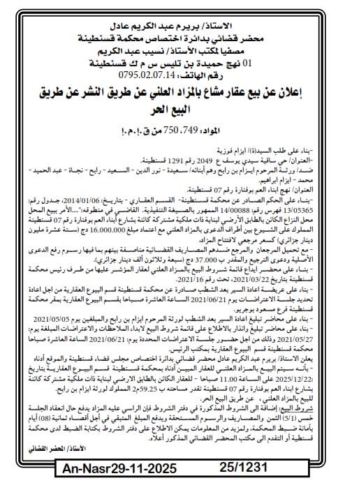 Il sera procédé à la vente au plus offrant et dernier enchérisseur le : 06/12/2025';