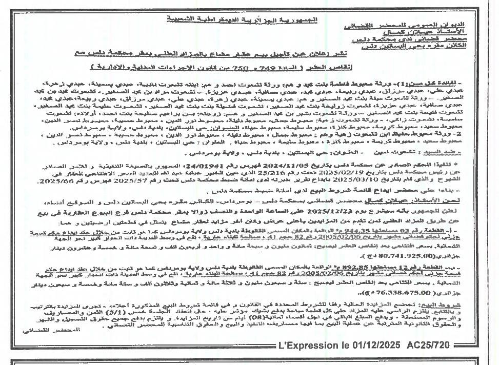 Il sera procédé à la vente au plus offrant et dernier enchérisseur le :