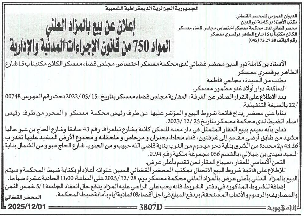 Il sera procédé à la vente au plus offrant et dernier enchérisseur le :