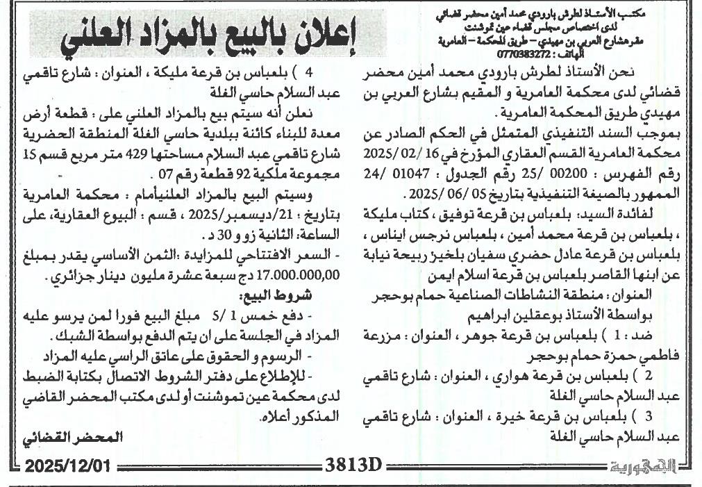 Il sera procédé à la vente au plus offrant et dernier enchérisseur le :