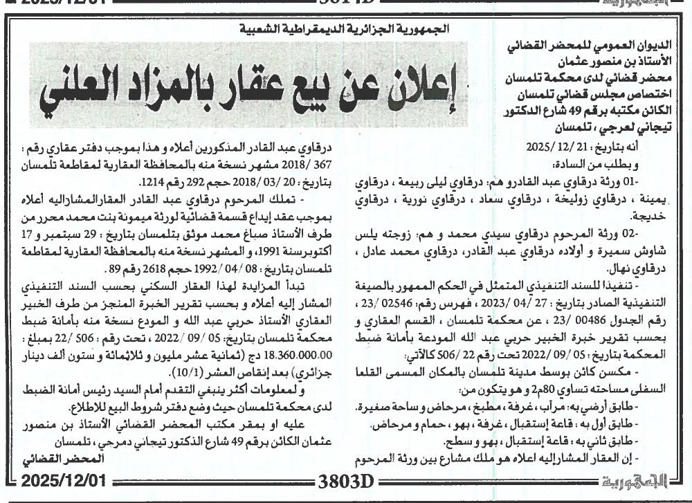 Il sera procédé à la vente au plus offrant et dernier enchérisseur le :