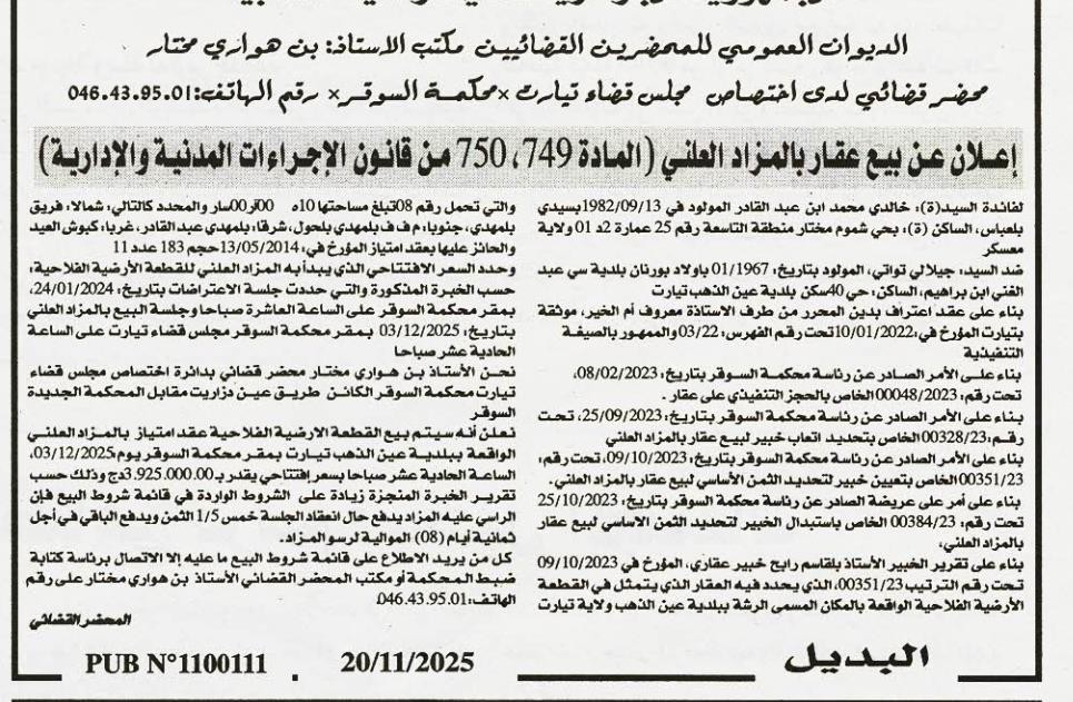 Il sera procédé à la vente au plus offrant et dernier enchérisseur le : 03/12/2025
