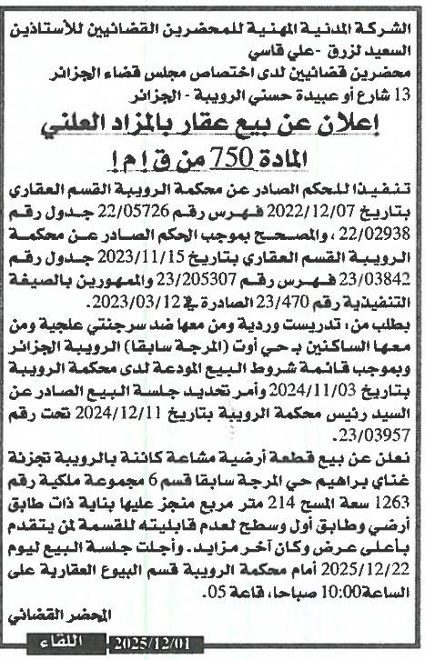 Il sera procédé à la vente au plus offrant et dernier enchérisseur le :