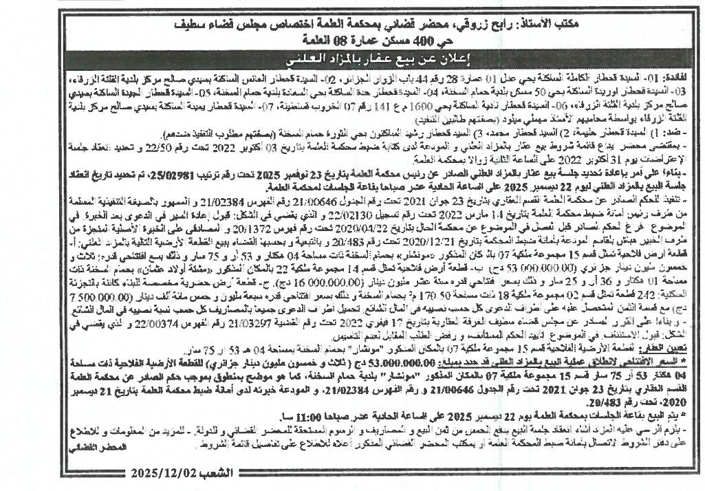Il sera procédé à la vente au plus offrant et dernier enchérisseur le : 09/12/2025';
