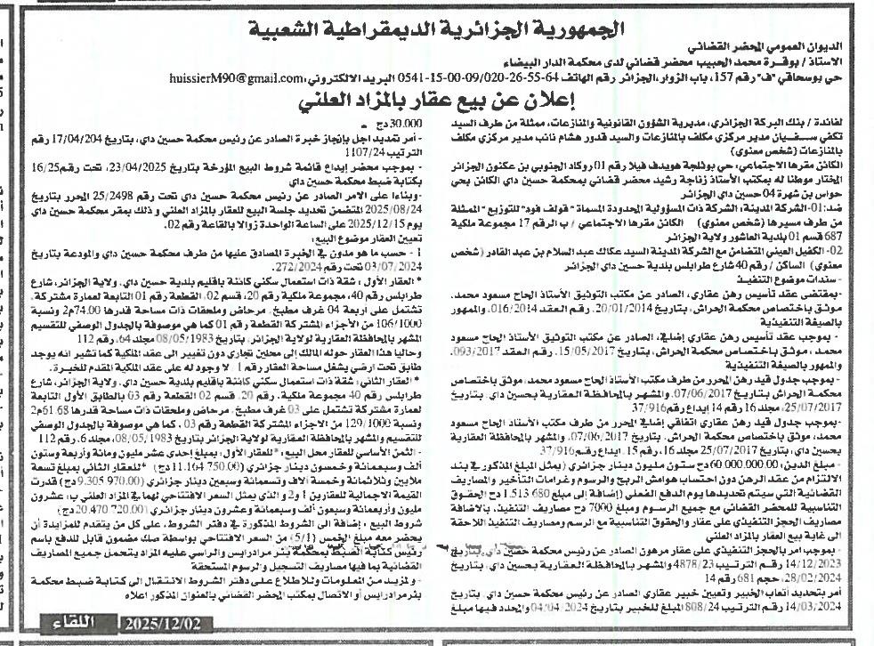Il sera procédé à la vente au plus offrant et dernier enchérisseur le :