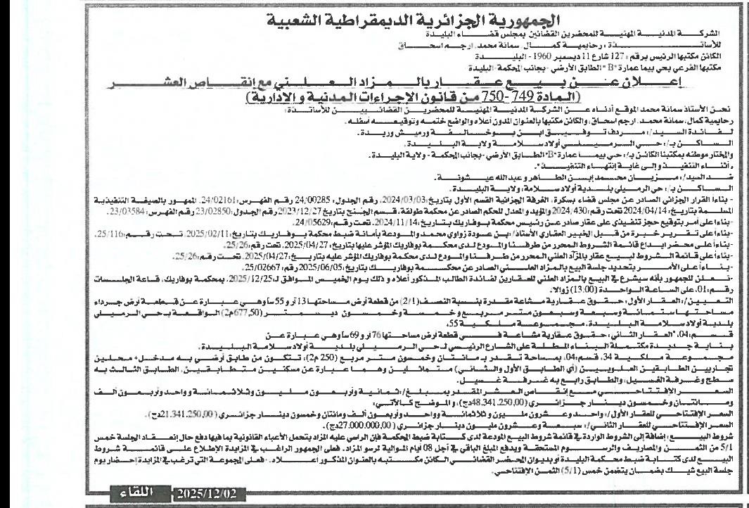 Il sera procédé à la vente au plus offrant et dernier enchérisseur le : 09/12/2025';