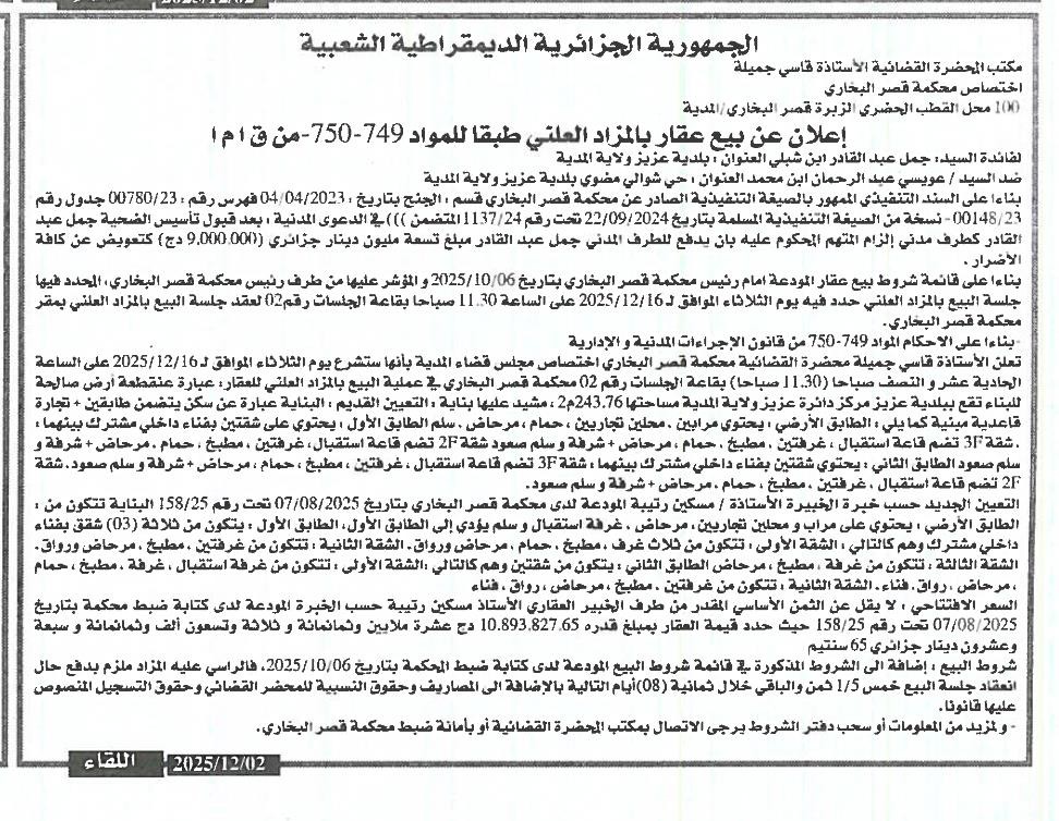 Il sera procédé à la vente au plus offrant et dernier enchérisseur le :