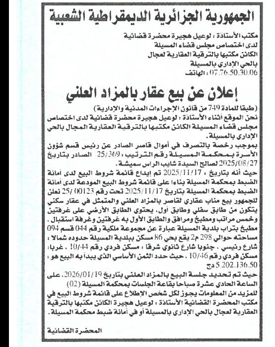 Il sera procédé à la vente au plus offrant et dernier enchérisseur le :