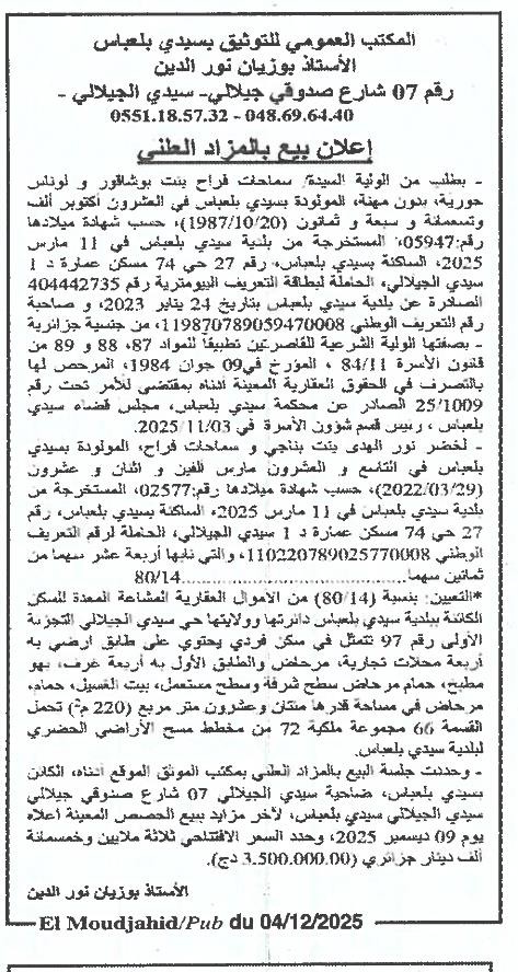Il sera procédé à la vente au plus offrant et dernier enchérisseur le :