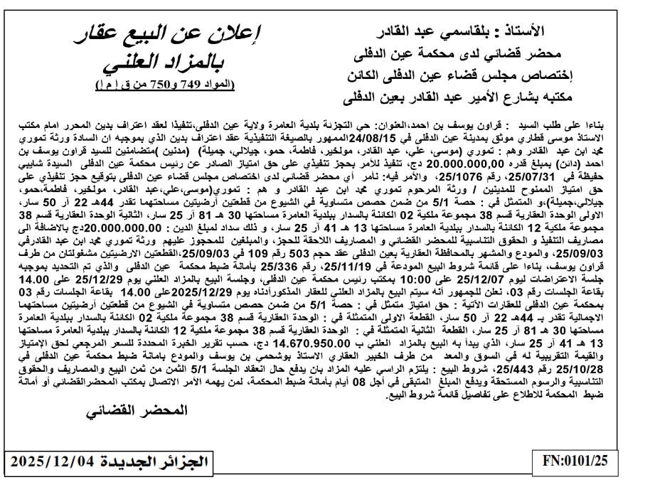 Il sera procédé à la vente au plus offrant et dernier enchérisseur le :