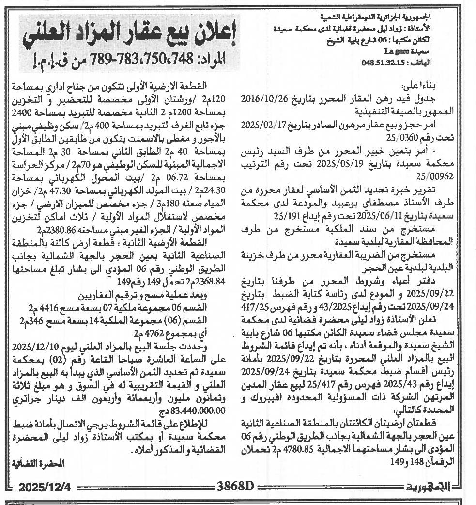Il sera procédé à la vente au plus offrant et dernier enchérisseur le :