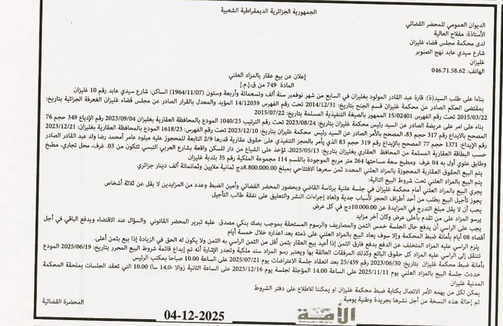Il sera procédé à la vente au plus offrant et dernier enchérisseur le :