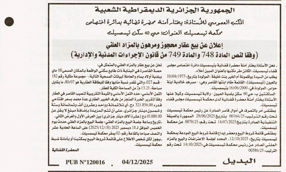 Il sera procédé à la vente au plus offrant et dernier enchérisseur le :