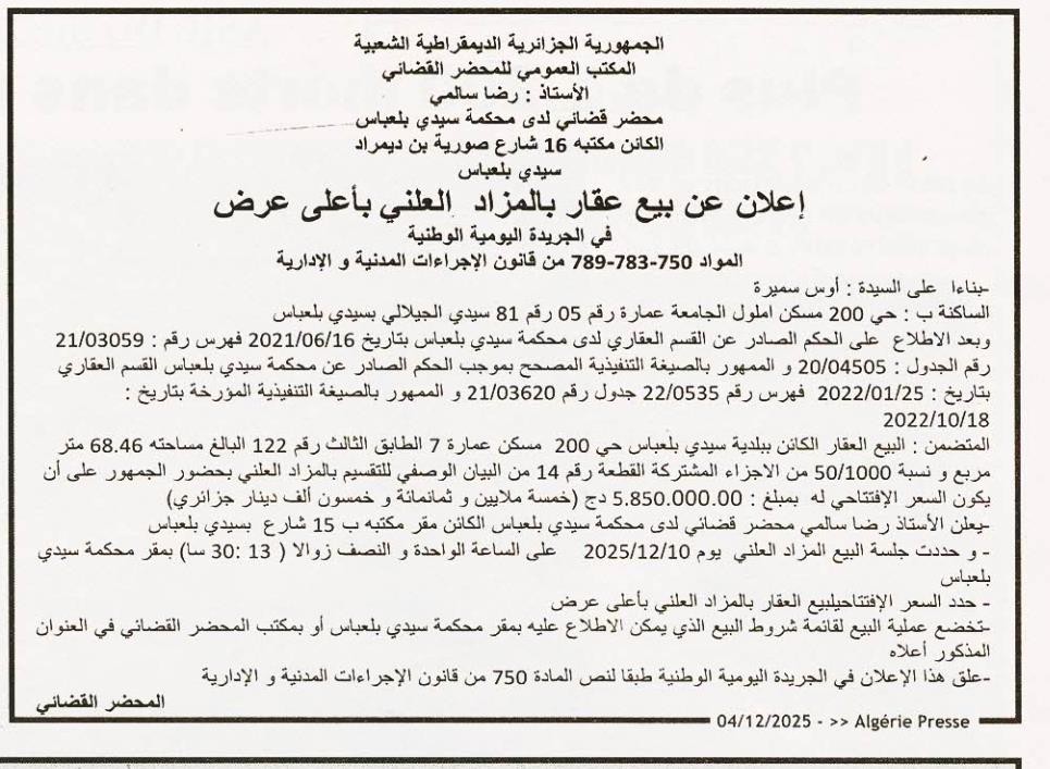 Il sera procédé à la vente au plus offrant et dernier enchérisseur le : 10/12/2025';