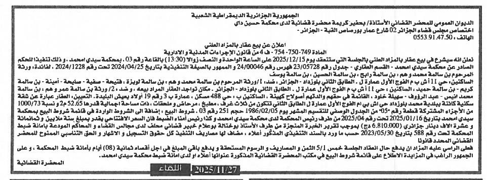 Il sera procédé à la vente au plus offrant et dernier enchérisseur le :