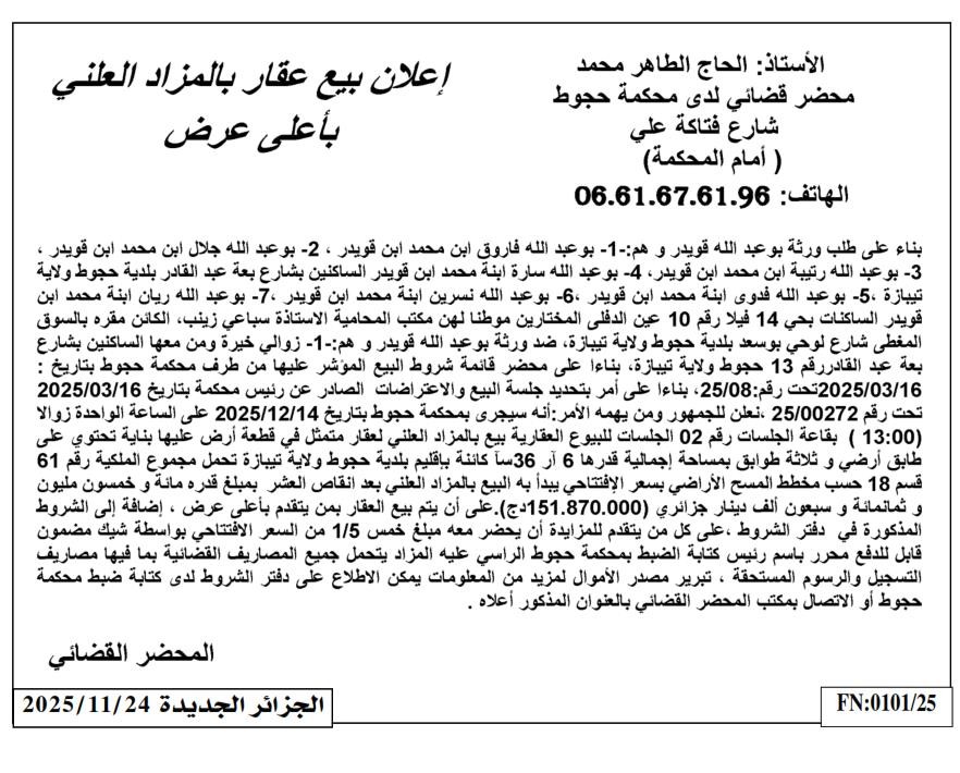 Il sera procédé à la vente au plus offrant et dernier enchérisseur le :