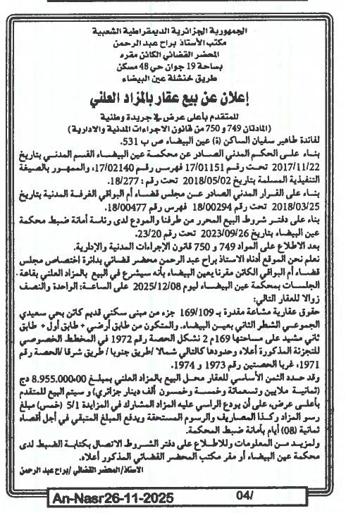 Il sera procédé à la vente au plus offrant et dernier enchérisseur le :