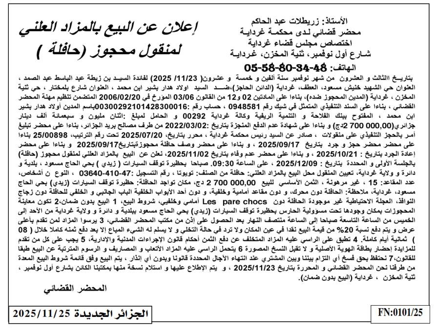 Il sera procédé à la vente au plus offrant et dernier enchérisseur le :