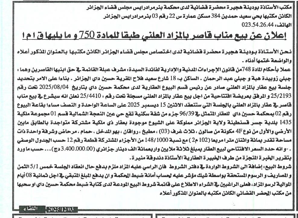 Il sera procédé à la vente au plus offrant et dernier enchérisseur le :