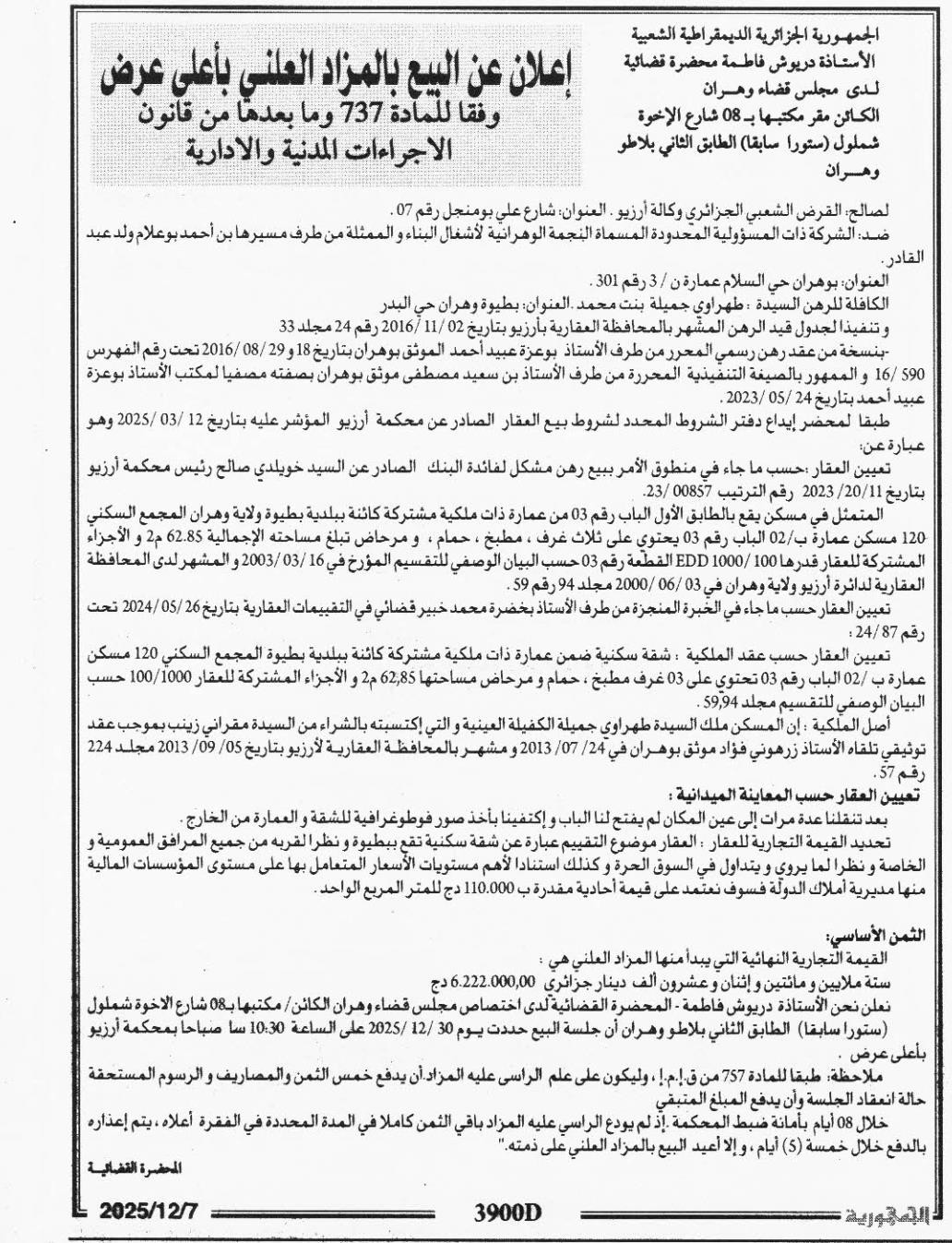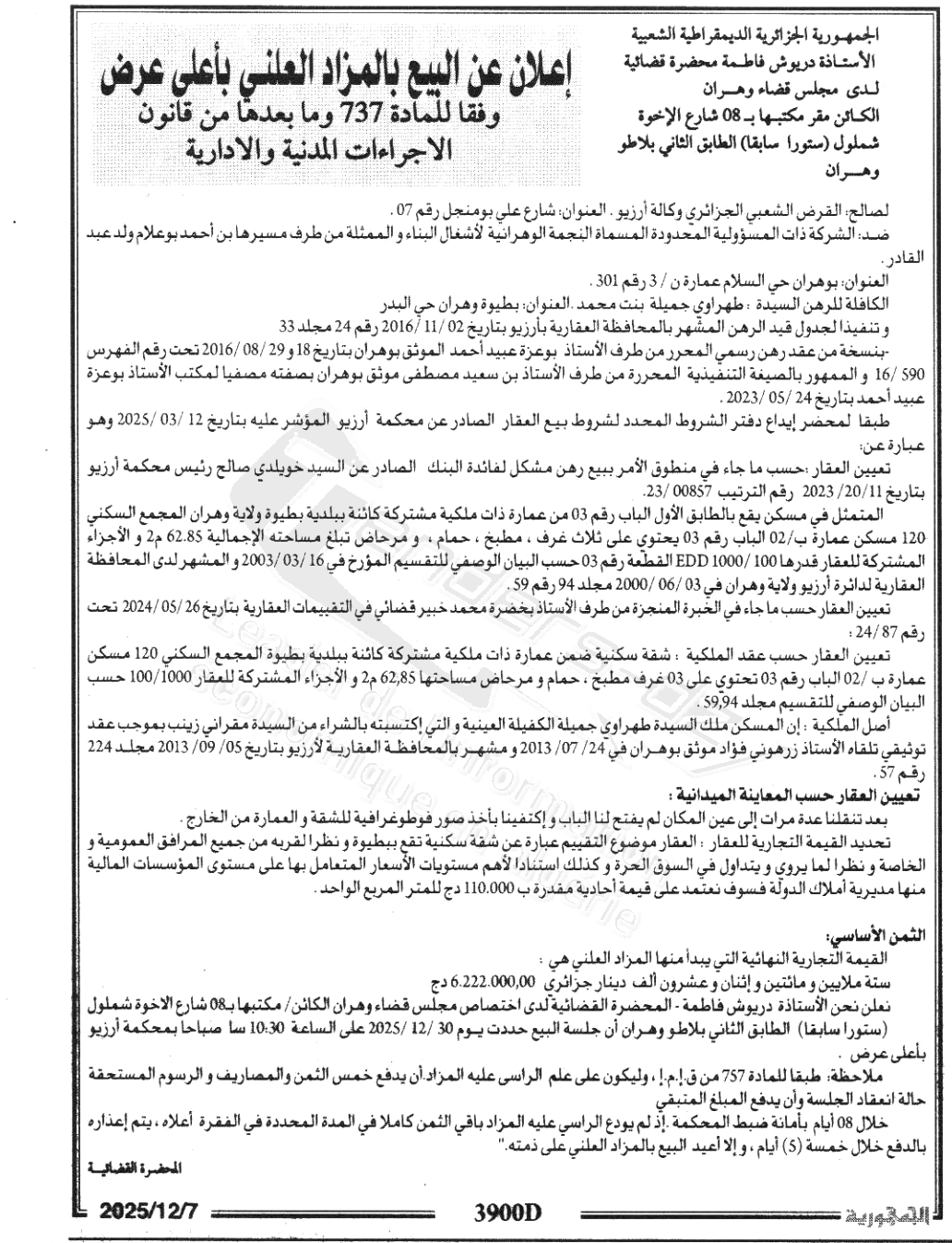 Il sera procédé à la vente au plus offrant et dernier enchérisseur le :