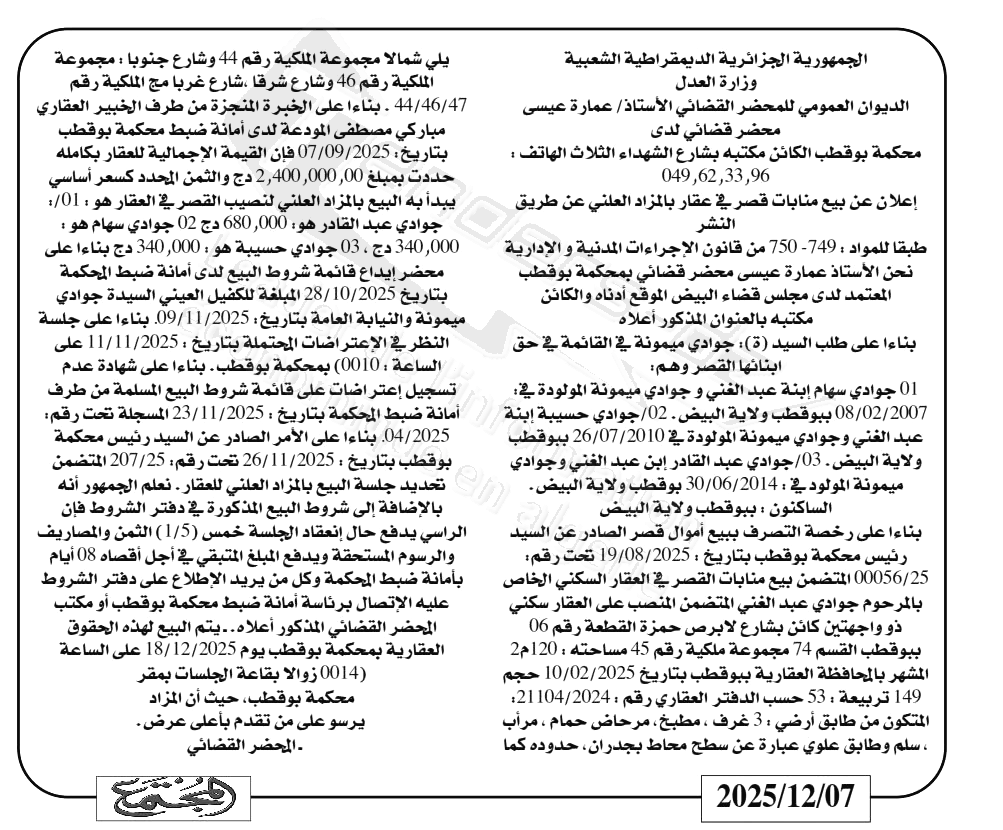 Il sera procédé à la vente au plus offrant et dernier enchérisseur le : 18/12/2025';