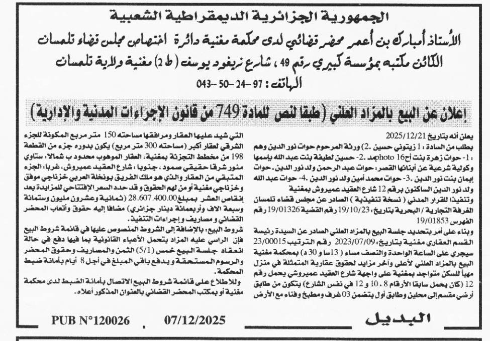 Il sera procédé à la vente au plus offrant et dernier enchérisseur le :