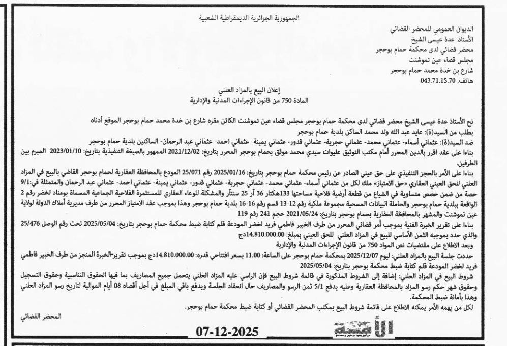 Il sera procédé à la vente au plus offrant et dernier enchérisseur le :
