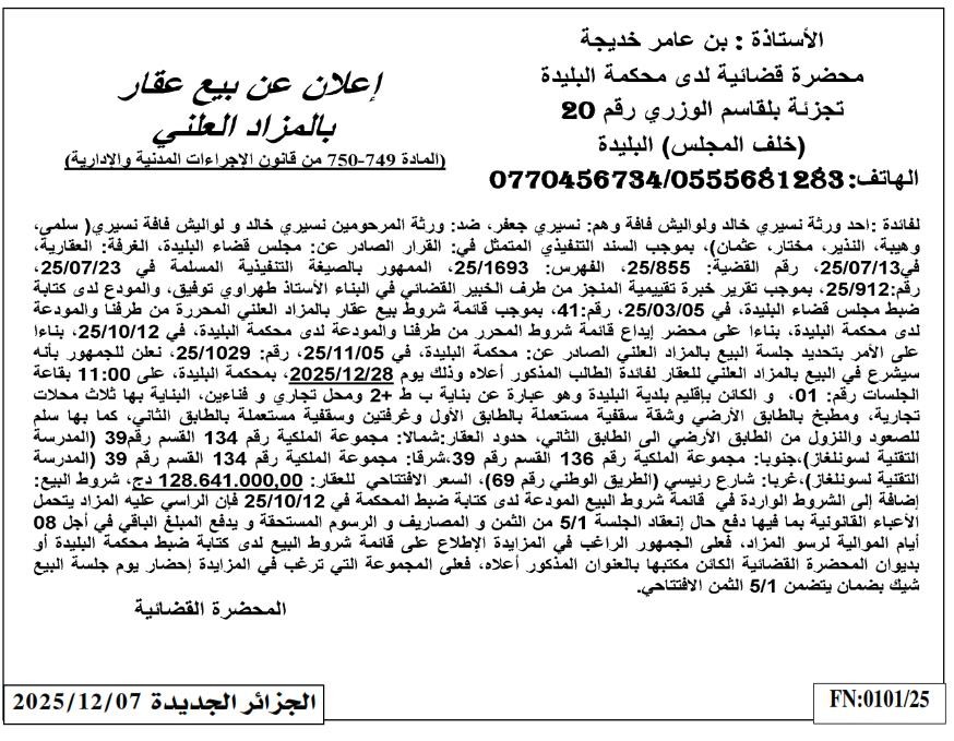 Il sera procédé à la vente au plus offrant et dernier enchérisseur le :