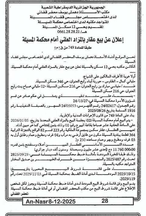 Il sera procédé à la vente au plus offrant et dernier enchérisseur le :