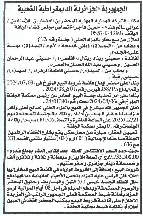 Il sera procédé à la vente au plus offrant et dernier enchérisseur le : 15/12/2025';
