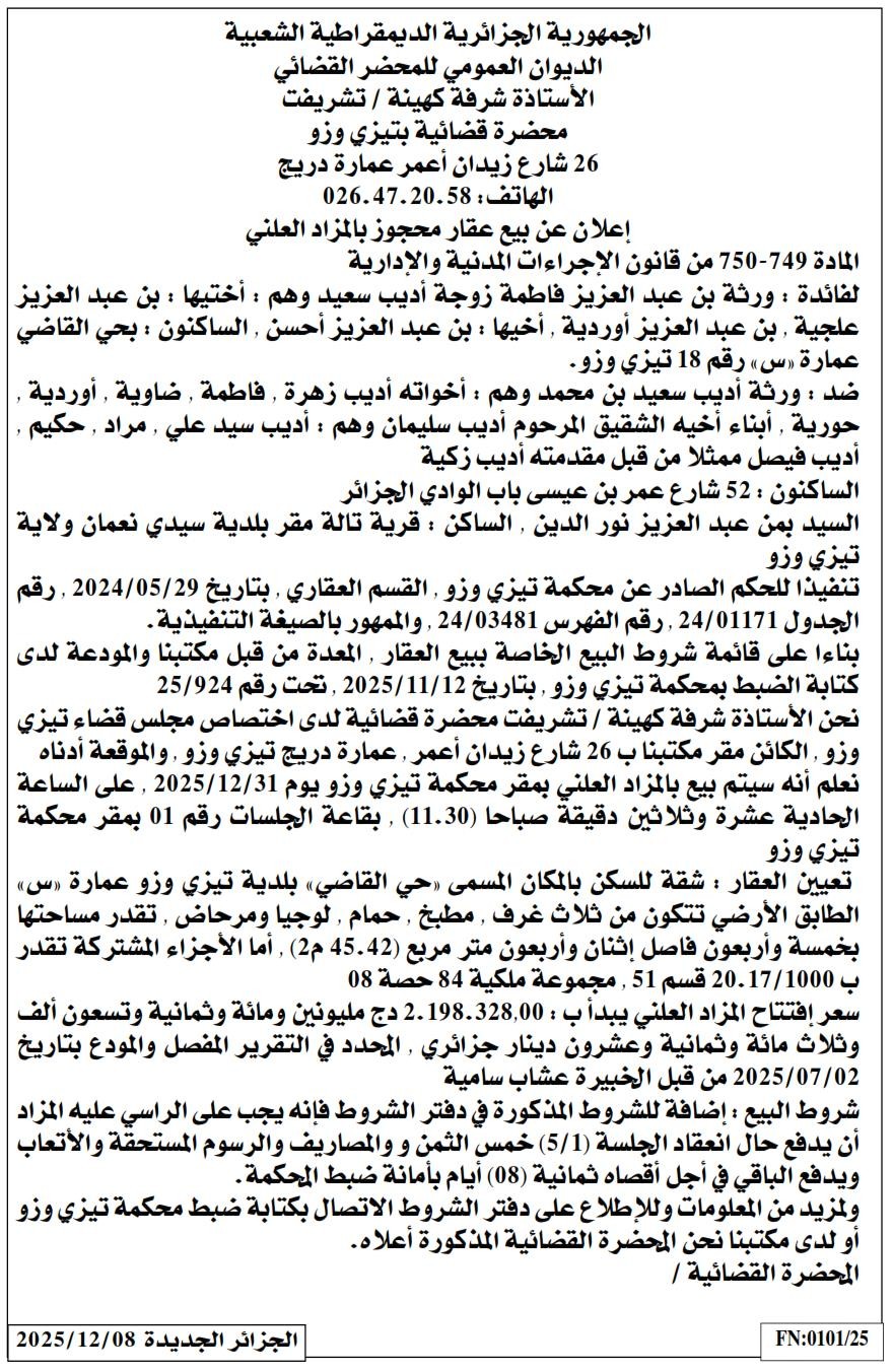 Il sera procédé à la vente au plus offrant et dernier enchérisseur le :