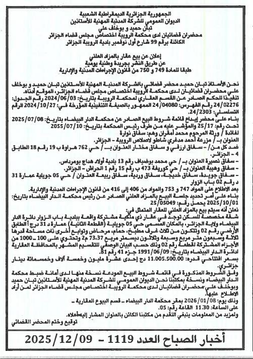 Il sera procédé à la vente au plus offrant et dernier enchérisseur le :