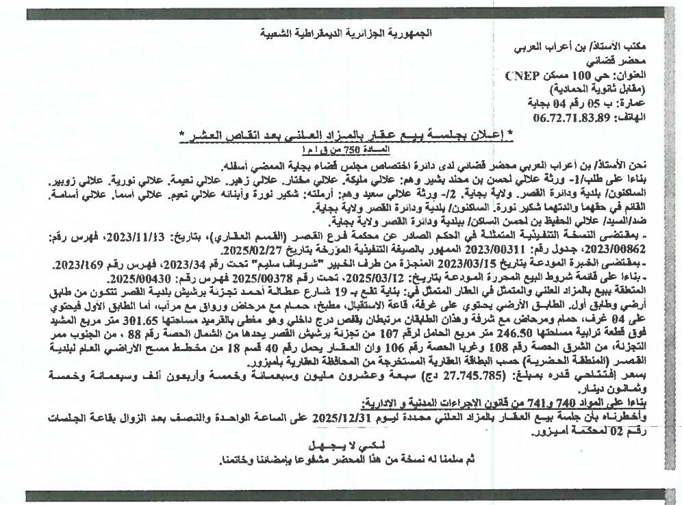 Il sera procédé à la vente au plus offrant et dernier enchérisseur le :