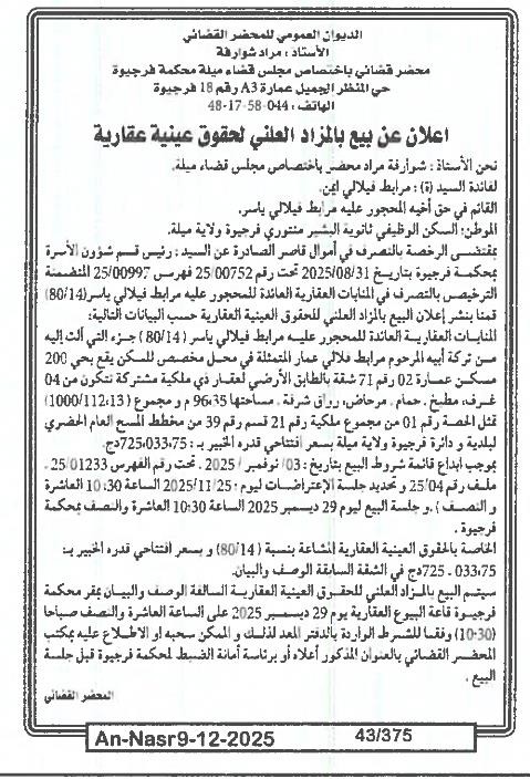 Il sera procédé à la vente au plus offrant et dernier enchérisseur le :