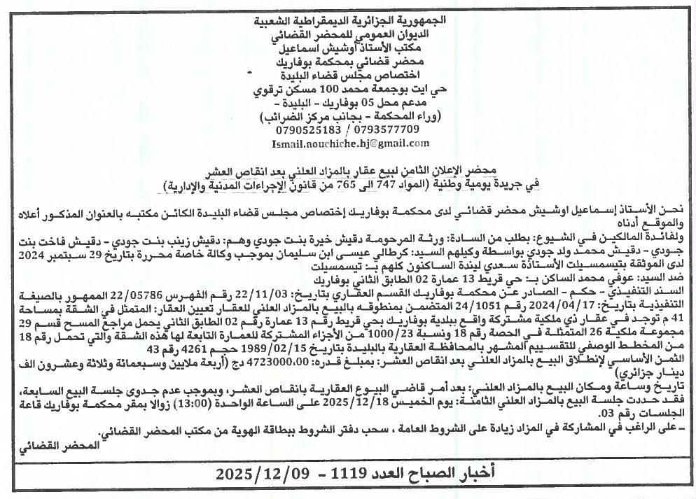 Il sera procédé à la vente au plus offrant et dernier enchérisseur le :