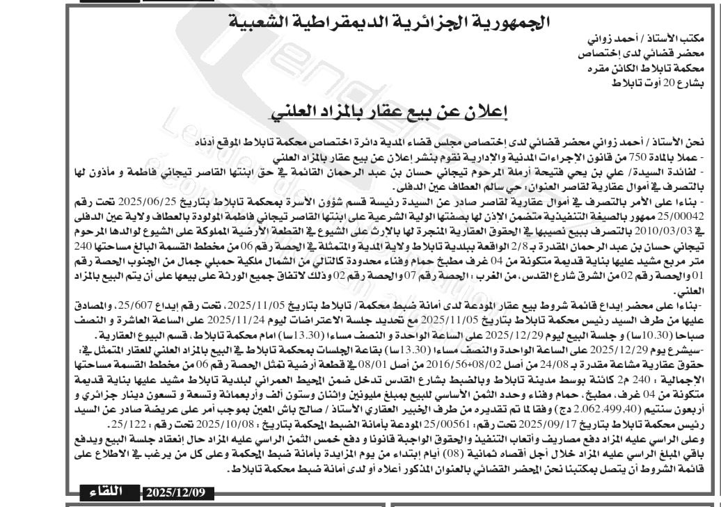 Il sera procédé à la vente au plus offrant et dernier enchérisseur le :